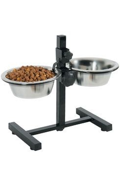 Stojan na misky v černé barvě. Dvě misky 0,7l jsou součástí balení.Nastavitelný stojan je vhodný pro malé plemena.