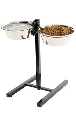 Stojan na misky v černé barvě. Dvě misky 2,5l jsou součástí balení.Nastavitelný stojan je vhodný pro velké plemena.