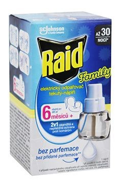 Raid nahradní tekutá náplň bez parfemace poskytuje účinnou ochranu, působí rychle proti komárům a ostatnímu drobnému létajícímu hmyzu i při mírně otevřených oknech a rozsvícených světlech až po dobu 30 nocí, při používání 8 hodin/noc. Ochrání místnost do 30 m3. Lze použít do předešlých Raid odpařovačů. Další upozornění a návod pro použití je uvnitř obalu