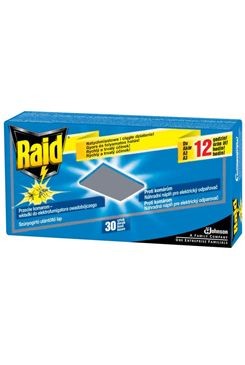 Raid náhradní polštářky do elektrického odpařovače proti létajícímu hmyzu.Raid znamená skutečnou ochranu před komáry. Raid je insekticidní přípravek, který poskytuje velmi účinnou a dlouhodobou ochranu proti komárům a drobnému létajícímu hmyzu. Účinně odpuzuje létající hmyz, a to i při otevřených oknech a rozsvícených světlech. Raid polštářky lze používat i v obdobných odpařovačích. Raid začíná působit během několika minut.