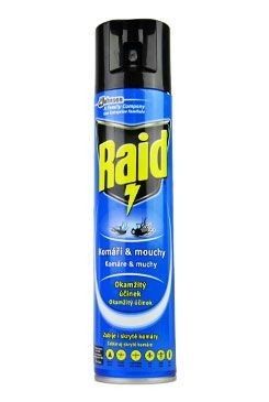 Raid proti komárům a mouchám je insekticidní aerosolový přípravek na vodní bázi se svěží vůní k okamžitému hubení létajícího hmyzu, jako jsou komáři, mouchy, jejich vajíčka, ale i vosy a další. Poskytuje dlouhotrvající ochranu a účinkuje i jako preventivní odpuzující postřik.