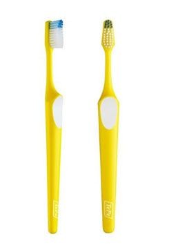 Středně tvrdý zubní kartáček se zužující se hlavičkou a zástřihem ukončeným aktivní špičkou.