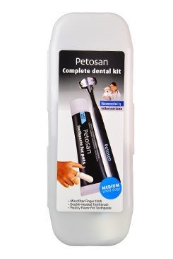 Petosan kompletní sada zubní péče, pro střední plemena psů- sada obsahuje: Petosan zubní pastu 70g, Petosan dvouhlavý zubní kartáček, Petosan zubní kartáček na prst z mikrovlákna.
