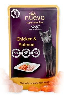 Nuevo kočka adult kuře a losos kapsička je kompletní krmivo pro dospělé kočky všech plemen, obohacené o kuřecí a lososí maso. Toto krmivo se může pyšnit svojí kvalitou, kterou reprezentuje vysoký obsah masa a přírodních suroviny, naopak neobsahuje žádné umělé přísady, obilí a lepek.