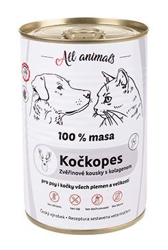 Monoproteinová konzerva All Animals s kolagenem představuje superprémiové krmivo pro psy a kočky všech velikostí a plemen. Obsahuje kousky zvěřiny doplněné o kolagen, který podporuje funkčnost pohybového aparátu. Konzerva je vyrobena bez obilovin, dochucovadel i konzervačních a barvících látek. Jde o velmi chutné, výživné a snadno stravitelné krmivo. Šetrné zpracování zaručuje lahodnou chuť i vůni. Vyrobeno v?České republice, z lokálních surovin. S přídavkem oleje z ostropestřce mariánského.