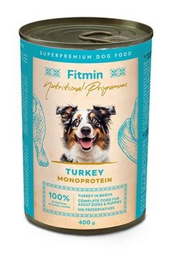Kompletní mokré krmivo pro dospělé psy všech plemen z řady Fitmin Výživový program je vyrobeno z čerstvého masa. Krmivo je vhodné i pro štěňata a mladé psy. Lahodné krmivo je vhodné na ochucení granulí nebo za odměnu do misky. Monoproteinová konzerva s krůtím masem je vhodná pro malé i velké mlsné psy. Mokré krmivo Fitmin Výživový program je bez obilovin, bez GMO a neobsahují žádná barviva, umělé konzervační látky a dochucovadla.