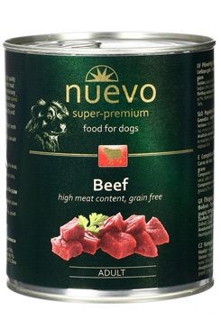 Nuevo konzerva s hovězím masem je speciálním krmivem pro dospělé psy. Vysoký obsah masa 72% obsahující velké množství cenných bílkovin. Dokonale vyvážená a komplexní strava s optimální úrovní všech výživných látek, esenciálních vitamínů a minerálů. Hovězí konzerva pro psy je výborný zdroj energie, výborně stravitelná a obzvláště chutná strava.