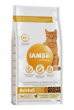 Krmivo IAMS for Vitality pro redukci chlupových bezoárů pro dospělé kočky a kočičí seniory je 100% kompletní a vyvážené, odborníky sestavené krmivo, které bude vašemu zvířeti chutnat a svědčit. Naše nová a vylepšená receptura s čerstvým kuřecím masem je založena na kvalitních živočišných bílkovinách pečlivě vybraných tak, aby u dospělých koček a kočičích seniorů podporovaly sedm znaků zdravé vitality. Aby byly kočky zdravé, aktivní a plné energie, přidáváme do svých lahodných receptur až 89 % živočišných bílkovin (z celkového obsahu bílkovin). Naše receptura pro omezení tvorby chlupových bezoárů pomáhá kočce tyto potíže lépe zvládat.Naším závazkem je nabídnout kočkám specializované krmivo se skvělou chutí, které si váš domácí mazlíček bezvýhradně zamiluje a které bude podporovat všech sedm znaků zdravé vitality. Oproti našemu běžnému krmivu IAMS pro dospělé kočky s čerstvým kuřecím masem pomáhá tato receptura snižovat tvorbu chlupových bezoárů až dvakrát efektivněji. Díky vyváženému obsahu omega-3 a omega-6 mastných kyselin v krmivu IAMS budete moct obdivovat zdravou kůži a lesklou srst svého zvířete. Své receptury jsme vyvinuli tak, aby snižovaly pH v močové soustavě a udržely ji zdravou. Připravte se, že vaše kočka bude skákat a řádit. To díky kvalitním bílkovinám a nezbytným minerálům, které pomáhají udržet zdravé svaly a kosti. Kombinace antioxidantů s vitamínem E posiluje imunitu, takže ji už při výpravách nic neohrozí. A až ji uslyšíte chroupat naše granule s vyváženým obsahem minerálů v každém soustu, můžete si být jisti, že bude mít silné a zdravé zuby. Při úklidu kočičí toalety oceníte zdravé trávení kočky díky optimální kombinaci vlákniny, prebiotik a řepné dužiny. Naše krmiva navíc obsahují základní živiny, jako např. taurin, pro zdravé srdce, aby vám váš miláček nikdy nepřestal projevovat lásku.