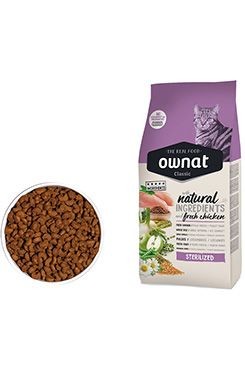OWNAT CLASSIC CAT Sterilized je krmivo určené pro sterilizované kočky, které mají nižší energetické nároky a větší sklon k přibírání na váze. Toto krmivo obsahuje nižší podíl tuku a je bohaté na kvalitní bílkoviny z kuřecího masa, které pomáhají udržovat zdravou svalovou hmotu. Přidané brusinky podporují zdraví močového ústrojí, což je častá potřeba sterilizovaných koček.