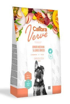 Calibra Dog Verve Junior Medium and Large Breed (Chicken & Duck) je kompletní suché krmivo s čerstvým masem a bez obilovin. Receptura je určená pro mladé psy ve věku 3-30 měsíců středních a velkých plemen s hmotností nad 10 kg.Vysoký obsah čerstvého kuřecího masa 30 % a kvalitní kachní protein je zárukou přirozeně výživné porce, která je v souladu s fyziologickými potřebami psa, potřebné pro správný růst a vývoj mladého organismu.Čerstvé maso je vysoce výživným zdrojem bílkovin, který se vyznačuje atraktivní chutí, a je vhodné i pro citlivé zažívání.