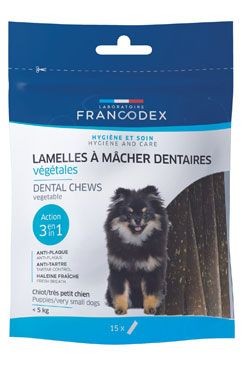 Doplňkové krmivo pro štěňata a velmi malé psy do hmotnosti 5kg.Vlastnosti: Žvýkací plátky jsou velmi lehce stravitelné. Jejich tvar a textura usnadňuje žvýkání a zlepšuje čištění zubů. Mechanické abrazivní působení pomáhá odstranit povlak na zubech a omezuje tvorbu zubního kamene. Podporuje svěží dech.