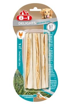 Žvýkací tyčinky 8in1 Delights Dental jsou vyrobené z kuřecího masa, které je obohaceno o speciální formuli proti zubnímu plaku. Chutný prémiový pamlsek si zamiluje každý čtyřnohý kamarád. Pamlsky pro psy Delights obsahují pouze 2 % tuku, neobsahují umělá barviva a dochucovadla. Pravidelné žvýkání eliminuje tvorbu zubního plaku a kamene.