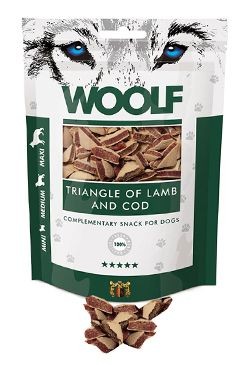 Měkký masový pamlsek z jehněčího masa s treskou ve tvaru trojúhelníčku je vhodný pro malá a střední plemena psů. Pamlsek díky svému tvaru podněcuje psy ke žvýkání. Balení obsahuje velké množství pochoutek, které již nemusíte pro psa lámat, aby bylo možné podat odměnu vícekrát. Pamlsek je měkký a vhodný jak pro dospělé psy tak i štěňata a starší psy. Díky obsahu jehněčího masa a tresky vhodný i pro citlivé a alergické psy. Pochoutka je vhodná i pro kočky. Pochoutky Woolfsnacks jsou speciálně navrženy pro psy všech plemen. Při výrobě jsou ze 100% použity bílkoviny té nejvyšší kvality pro co nejlepší příjem potravy. Veškeré pochoutky Woolfsnacks, jakmile se vyrobí, jsou zabaleny bez chemických přísad, konzervačních látek, nebo barviv. K zajištění ochrany je do sáčku umístěn absorbér kyslíku. Nekonzumovat okysličovadlo.