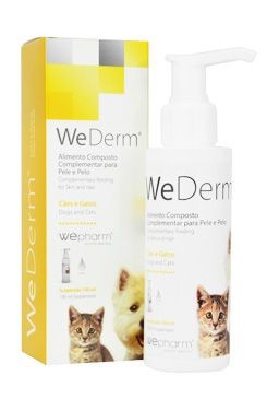 Výživový doplněk pro psy a kočky s vysokým obsahem esenciálních mastných kyselin, vitamínů a minerálů určených k podpoře kožní funkce v případech dermatózy, svědění, vypadávání chlupů nebo jakéhokoliv jiného dermatologického projevu alergie. WeDerm ® zaručuje synergický účinek s protizánětlivým účinkem, snižuje potřebu steroidů, snižuje zánět a svědění a zlepšuje bariérový účinek pokožky podporující posilování meziproduktových epidermálních ceramidových lipidových vrstev.