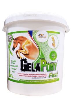 GELAPONY FAST - KLOUBY - AKUTNÍ BOLESTIVÝ STAVSpecializované doplňkové krmivo s Boswellií Serratou, kolagenními peptidy CHP, vitamínem E a selenem k akutní aplikaci při poraněních a zhmožděních pohybového aparátu koní či rychlému zvýšení flexibility kloubů a elasticity pohybu. Lze jej použít před i v průběhu závodů v případech, kdy by byla vhodná aplikace protizánětlivých léků, které z důvodu antidopingových zkoušek nelze použít.
