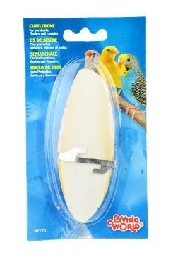 Sépiová kost s kovovým držátkem pro andulky a korely. Účinná pomůcka při obrušování zobáku a cenný zdroj vápníku pro ptáky.