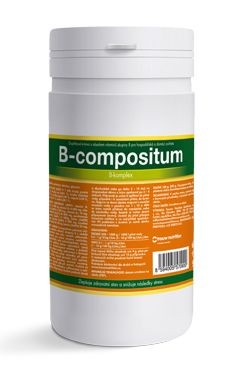 Vitamin B1, Vitamin B2, Vitamin B6, Vitamin B12, Niacinamid, Pantotenan vápenatý, Biotin, Inositol. Krmný návod: Doplňkové krmivo B-compositum se používá při výskytu poruch vyplývajících z nedostatku vitaminů skupiny B, poruchy kůže, opeření a srsti, nervové soustavy, při anémii, perosis, při zátěži vznikající v období intenzivního růstu, vysoké užitkovosti i jiném stresu. Velmi vhodné je jeho používání u zvířat v reprodukci ( zlepšení reprodukčních schopností zvířat, snížení embryonální úmrtnosti, dále pro dobrý vývoj plodu a zlepšení následné životaschopnosti mláďat ), u drůbeže ve snášce, u mláďat, v rekonvalescenci, po léčbě antibiotiky, sulfonamidy a antikokcidiky.