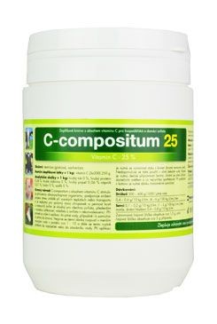 C-Compositum 25procent je kompletní krmná přísada biologicky účinných látek. Pomáhá ke zvýšení obranyschopnosti organismu vůči infekčním onemocněním, zejména u mláďat všech druhů zvířat. Při mimořádném zatížení v důsledku transportního a tepelného stresu a při všech stavech vyčerpanosti organismu. Při dermatózách, anémiích, krvácení, při poruchách reprodukce a pro podporu hojení ran a zlomenin. U drůbeže k příznivému ovlivnění snášky a kvality skořápky, pro optimální vývoj embryí kuřat a jejich správný vývoj v preinkubačním období. C-