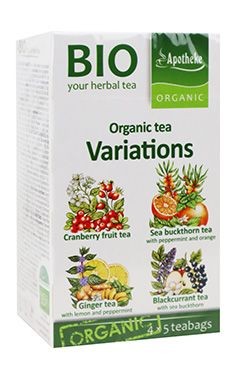 Apotheke BIO čajové variace je směs ovocných a ovocno-bylinných čajů porcovaných v nálevových sáčcích. BIO ovocné čaje se užívají k doplnění pitného režimu. U přípravků je možné doložit původ bylin, nepoužívají se umělá hnojiva a pesticidy, nad výrobky má dozor certifikační organizace.