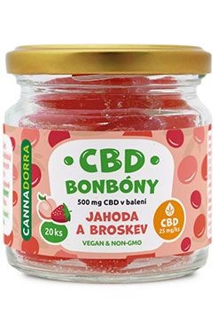Balení obsahuje 20 kusů bonbónů (10x jahoda, 10x broskev) a každý bonbón obsahuje 25 mg CBD (vše o účinkách CBD).