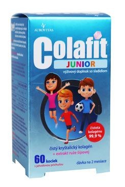 COLAFIT je doplněk stravy s kolagenem v měkkých kostičkách, určený zvláště pro děti. Přípravek s jahodovou příchutí obsahuje čistý krystalický kolagen typu I 99,9% a extrakt ze šípkové růže. Kolagen je přirozenou součástí kloubů a kloubní chrupavky, vazivových tkání, kloubních pouzder, kostí, kůže, zubů. Krystalická forma kolagenu je pro organismus lépe využitelná.