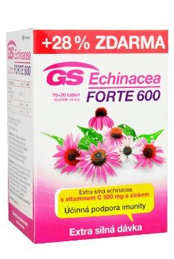 GS Echinacea Forte 600 je doplněk stravy ve formě tablet, který obsahuje extrakt z kořene (4:1 - 150 mg extraktu v jedné tabletě, což odpovídá 600 mg sušeného kořene) a navíc extra silnou dávku vitaminu C a zinku.