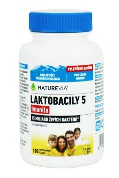 NatureVia Laktobacily 5 Imunita je doplněk stravy, který obsahuje unikátní komplex 5 vybraných kmenů laktobacilů a bifidobakterií lidského původu, které jsou přirozenou a nezbytnou součástí správně vyvážené střevní mikroflóry. S vitaminem C pro podporu imunity.