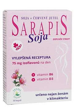 Sarapis Soja je doplněk stravy určený ženám v období klimakteria. Obsahuje červený jetel, včelí mateří kašičku, včelí pyl, vitamin C, vitamin D3, železo a vitamin B6.