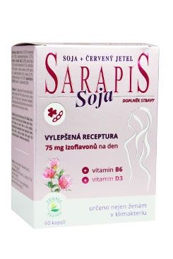 Sarapis Soja je doplněk stravy určený ženám v období klimakteria. Obsahuje červený jetel, včelí mateří kašičku, včelí pyl, vitamin C, vitamin D3, železo a vitamin B6.