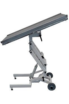 Univerzální veterinární stůl Tabtech SIMPL 16000 s nerezovou deskou bez žlábků pro snadné čištění. Stůl je hydraulický a se zabrzditelnými kolečky a disponuje longitudinálním náklonem.
