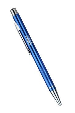 Kovová kuličková propiska s chromovými doplňky (špička, tlačítko, spona). Náplň pera je modrá, gelová.