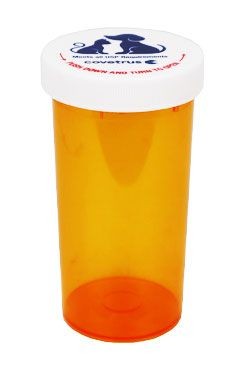 Lahvička na léky s dětským bezpečnostním uzávěrem, který je zapotřebí stlačit a otočit. Je označena logem Covetrus s dobře čitelnými pokyny k otevření a s velkou plochou pro označení.
