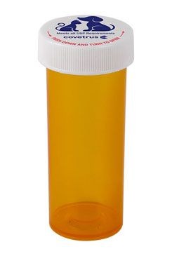 Lahvička na léky s dětským bezpečnostním uzávěrem, který je zapotřebí stlačit a otočit. Je označena logem Covetrus s dobře čitelnými pokyny k otevření a s velkou plochou pro označení.
