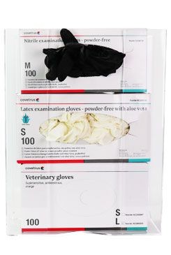 Průhledný akrylový zásobník na rukavice s prohlubní ve spodní části pro snazší vyjímání krabic na rukavice. S předvrtanými otvory pro montáž na stěnu (šrouby nejsou součástí dodávky). K dispozici jsou 3 velikosti: pro jednu, dvě nebo tři krabice na rukavice.